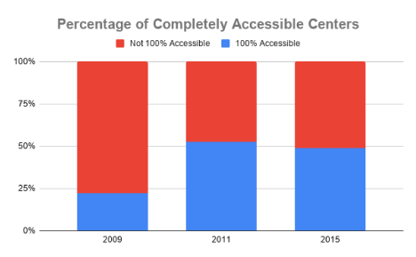 Overall, centers have shown a low level of compliance with ADA guidelines with approximately half of centers across the state failing to meet accessibility criteria in the four priority areas in Phase III. The lack of compliance has indicated the need for continued education and advocacy concerning ADA standards in medical centers, especially as equipment is replaced and new buildings are constructed.