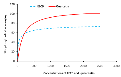 At IC5, IC10, IC20 and IC50, EECD scavenged NO. better at the respective concentrations (0.27 μg/ml, 0.069 μg/ml, 1.95 μg/ml and 12.04 μg/ml), compared to the standard quercetin at the following concentrations 5.35 μg/ml, 7.69 μg/ml, 11.45 μg/ml and 23.21 μg/ml respectively. The observed NO. scavenging effect of EECD may be due to the presence of such flavonoids as luteolin, kaempferol, quercetin, catechin, isorhamnetin [18].