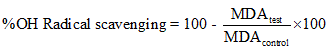 Calculation: Concentration of the thiobarbituric acid reactive substances (TBARS) was determined using the molar extinction coefficient of malondialdehyde. Inhibition of deoxyribose degradation which is a measure of hydroxyl radical scavenging ability was calculated by