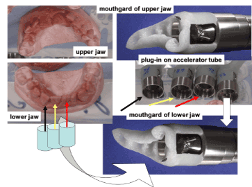 Figure 5. Part a: the mouthgard of upper jaw plugged on the accelerator tube for in-vivo analysis