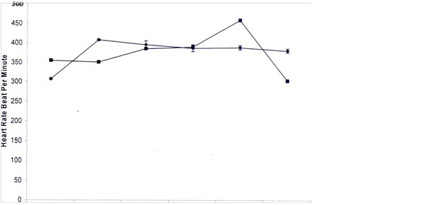 Electrocardiographic tracing showed gradual alteration on electrocardiogram with time. This alteration ranged from mild to severe until death of the animal occurred (Table 1 and Figures 3 and 4). The base-line value of the heart rate was 300 ± 0.00 beat per minute. Following administration of EESL, a gradual and significant (P < 0.001) decrease in the heart rate values (250 ± 0.00 beat/min 214.28 ± 0.00 beat/min, 188.57 ± 15.74 beat/min, 152.04 ± 9.37 beat/min, 156.66 ± 4.02 beat/min, 113.42 ± 6.68 beat/min, and 49.02 ± 0.39 beats per minute) occurred at 12 min, 22 min, 47 min, 77 min, 92 min and at 122 min, when the animal died.