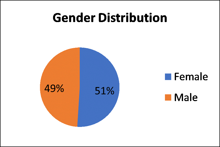 The gender distribution of the included 100 participants were 51females and 49 males. (Graph 1).
