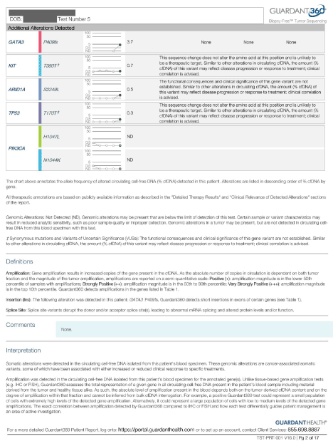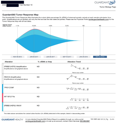 Her circulatory DNA was measured through Guardant360, and it was positive for PI3K and TP53 alterations with elevated MAF, measured on 11/9/15, 12/1/15 and negative on 12/30/15. She received trastuzumab along with IV epigenetic therapies, which could explain the disappearance of ERBB2 from her CTC and/or cDNA, however there are no expected positive effects from trastuzumab on P53, or PI3K, nor the cMYC present at her initial CTC. We contribute these results to the IV epigenetic therapies she received in the interim, as this therapy in fact targets cMYC, P53 and PI3K simultaneously.