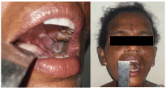 A total of six patients were surgically treated after obtaining informed written consent and due permission from the institutional ethics committee. Patients’ demographics and preoperative maximum inter incisior distance (Figure 1a) were illustrated in table 1. All the patients were clinically evaluated by Oromaxillofacial team and Digital Orthopantomogram was taken to rule out intra-articular causes of trismus (Figure 1b).