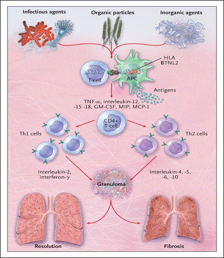 Sarcoidosis needs at least three key events to develop: exposure to antigen; acquired cellular immunity directed against the antigen mediated through antigen presenting cell and antigen specific T lymphocytes; as well as the appearance of immune effector cells necessary for promoting a more no-specific inflammatory response [22]. Granulomatous infiltration leading to the disruption of normal organ function is the major pathologic feature of sarcoidosis [1]. Figure 4 illustrates the pathogenesis of cardiac sarcoidosis.