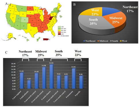 Figure 2. Distribution of obesity within United State. (A) Adult obesity prevalence maps. Prevalence of self-reported obesity among non-Hispanic white adults by state and Territory. (B) Pie chart of 4 main regions. (C) Bar graph of the proportion of obesity within each region. (https://www.cdc.gov/obesity/data/prevalence-maps.html & https://www.cancer.gov/about-cancer/causes-prevention/risk/obesity/obesity-fact-sheet)