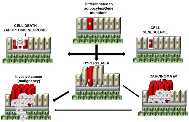 The proportion of obesity has been distributed various within United State (Figure 2). Obesity is known as a key contributory factor associated with cancer risk and mortality. Obesity has resulted increase cells accumulated lipids and slowly differentiated into mature adipocytes. Study also demonstrated that adipocytes are released chemokines to attract eosinophils and monocytes which release cytokine (interleukin-4, 5, -13, and TNFα) which resulted in helminth immunity, activated macrophages associated with glucose homeostasis [10]. Moreover, other study had demonstrated that adipocyte-associated lung neutrophilia and subsequent exacerbate the stimulatory effects of a primary tumor on neutrophils and further enhanced metastatic seeding [11]. Obesity produces an inflammatory state, characterized by macrophages clustered around enlarged hypertrophied, dead, and dying adipocytes from crown-like structures. There are two different type of adipocyte (white or brown). They have different metabolic demands. Due to adipocyte size and taken over the reasonable space, tissues may damage and slow recovery due to chronic inflammation damage which potentially decreases cell proliferation and increases tissue damage. This abnormal condition results in an increase in fibrous tissue and further leads to the development of cancer [12]. Adipocytes has been suggesting as a major factor in provide as seed and soil to manipulate the microenvironments, may differentiated the normal cells toward to malignancy status (Figure 3). Thus, adipocytes may contribute significant to inflammation, immunity, extracellular matrix mechanics, epigenetic or transcriptional regulation, and protein translation in cancers.