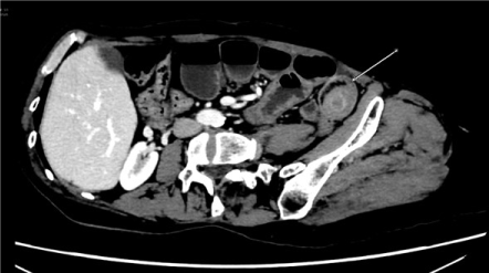 Figure 1. Axial abdominal computer tomography revealing a bowel intussusception’s target-mass image (arrow) associated to a mechanical ileus