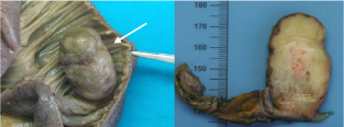 A nasogastric tube was placed, and the patient underwent a laparotomy. The small bowel exploration confirmed an intussusception adjacent to palpable intraluminal mass. With limited manipulation of this segment, a 36 cm length segmental resection of the small bowel, 50 cm from the jejuno-ileal junction with side-to-side anastomosis and lymph node dissection was performed.