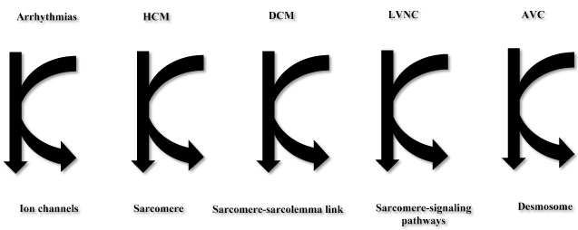 The past two decades has seen the identification of many genes whose mutations are responsible for the development of different types of CM. Towbin et al. [9,28] developed the “final common pathway” hypothesis for inherited cardiovascular disease (Figure 1). The hypothesis states that genes encoding proteins with similar functions or involved in the same pathway are responsible for the development for a particular disease or syndrome phenotype. The authors identified structural and functional similarities in proteins encoded by genes whose disruption leads to a somewhat predictable gross clinical phenotype. The authors found out that, causative genes for inherited arrhythmic disorders encode for ion channels, those for HCM encode for sarcomeric proteins, and those for AVC encode cell-to-cell junction proteins. In addition, protein altered by the mutated gene directly disrupts the normal function of the structures in which the protein is integrated such as mostly the sarcomere in HCM when the mutated gene encodes for a sarcomeric protein. In some instances, the mutated gene disrupts a binding pattern protein causing downstream disturbance of the final common pathway, such as a Z-disk protein disrupting the cell-to-cell junction through maladaptive binding to desmin, which negatively interacts with desmsomal protein causing AVC [9,28]. The main types of inherited CMs are HCM, DCM, AVC and RCM
