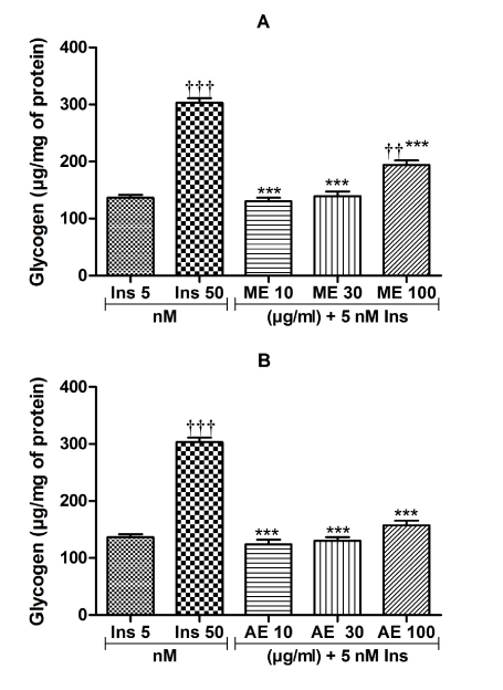 Figure 3. Insulin sensitizing effect of the methanol (A) and aqueous (B) extracts on glycogenolysis. Values are expressed as mean ± SEM; *p<0.05; **p<0.01, ***p<0.01, with respect to Ins 50 nM. †††p<0.001, with respect to Ins 5 nM. ME: methanol extract, AE: aqueous extract, Ins: insulin
