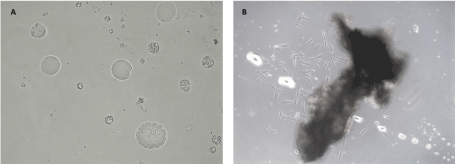 Figure 4. Primary culture of mesenchymal stem cells harvested from the tuberosity bone  A – The presence of amorphous structures, with an internal crystal shape, (200X); B – Amorphous, pearly-white structures located within the mesenchymal stem cells culture, interfering with the cells’ growth and migration from the explant (100X).