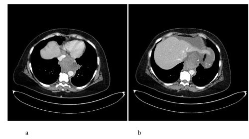 Figure 2. CT axial images after intravenous injection of iodinated contrast agent demonstrate a, b) the presence of mediastinal cloth, with distal intrathoracic esophagus compression