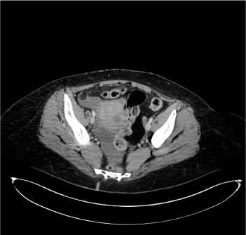 Figure 3. CT axial image after intravenous injection of iodinated contrast agent at the pelvis shows the presence of fluid collection due to hemoperitoneum
