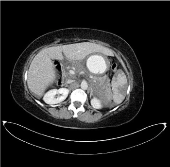 Figure 4. CT axial image after intravenous injection of iodinated contrast medium: evidence of hypodense triangular areas from the splenic hilum to the periphery, of the spleen due to ischemic injury