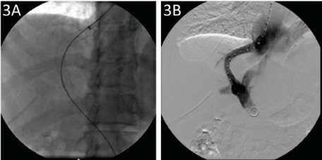 Total gastrectomy with curative intent is indicated based on the pathological findings, upper gastrointestinal endoscopy, and negative dissemination study. However, its performance implies a high risk of variceal bleeding, putting the patient’s life at risk. On the other hand, despite its effectiveness, endoscopic treatment of gastroesophageal varices is not an adequate strategy in this patient because it causes anatomical distortion, and complex surgical management in the tissues esophagojejunanastomosis will be performed. In this context, and to achieve curative treatment, we decided to decrease portal pressure prior to surgery by installing TIPS (Figure 3). Specifically, we proceeded to install TIPS portocava, which passed without incident.