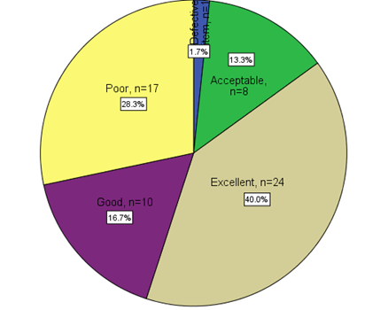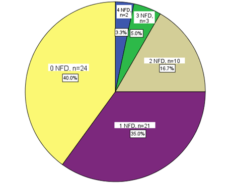 The distractor efficiency ranges from 0.00-100.00% (mean ± SD 75.83 ± 26.02%). Based on the distribution of the distractors, 24 items (40.0%,) 21 items (35.0%), 10 items (16.7%), 3 items (5.0%) and 2 items (3.3%) had 0, 1, 2, 3, 4 non-functioning distractors, respectively (Figure 3). On the overall, 58 (24.17%) and 182 (75.83%) were non-functional and functional distractors, respectively. The distractor effectiveness of the items in this study is close to previous reports with values of 63.85% [19], 63.55% [13], and lower than the values of 89.99% reported by Rao, et al. [4], 84.94% reported by Patel [14] and 89.60% reported by Gajjar, et al. [5].