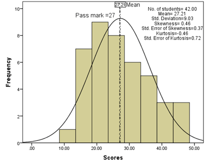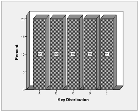 The distribution of the keys is equal (Figure 4) an indication that if a student’s guesses or chooses a particular option throughout, the highest score achievable is 20.0%. The distribution curve (a normal binomial distribution which highlights whether the data under examination has a binomial distribution or not) of the total score of the students MCQs items among first year student of Microbiology programme is shown in Figure 5. The distribution showed that the mean is 27.21 an indication that less students scored below the average. However, based on the pass mark of 40% (24 marks out of 60 maximum marks) more students passed the MCQs examination. Kurtosis and skewness is an important descriptive statistics of data distribution. Skewness provides information about the symmetry of the distribution, while kurtosis determines the heaviness of the distribution tails. The skewness was 0.46, an indication that the distribution curve is approximately or fairly symmetrical while the kurtosis value was -0.46, an indication of platykurtic distribution (with a negative excess kurtosis). The kurtosis reveals a distribution with flat tails, an indication of a small outliers in the distribution. A flat tail to the left shows that few students failed while a flat tail to the right shows that few students scored extremely well. This suggests that there are few students that scored exceedingly well in the examination.