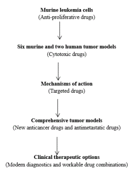 After long observations, it is found that different tumor models will yield different types of anticancer drugs. In the initial anticancer drug screen stage (before mid-1970s), murine leukemia cell lines (P388 and L1210) was used for anticancer drug discovery. At that time, anti-proliferative drugs (DNA chelating agents and so on) have commonly been found out. Lately, 6 murine tumors and two human colon tumor xenografts were widely used in drug screening. Among the utility of this tumor model system, growing numbers of anticancer drugs have been found (mainly cytotoxic anticancer drugs—targeting on DNA level).