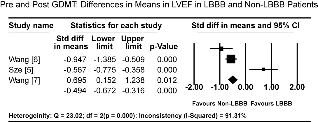 Figure 1. Pre and post GDMT: Differences in means in LVEF in LBBB and Non-LBBB patients