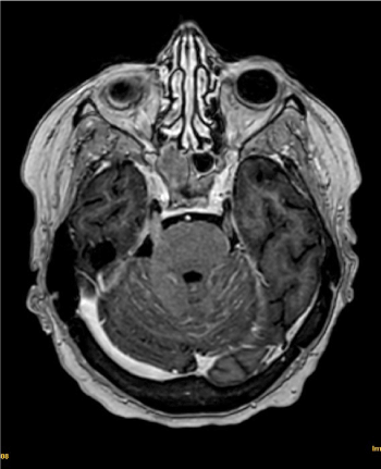 Given the persistence of the clinical picture, we decided to admit and repeat CT with contrast iv, which describes findings compatible with leptomeningeal involvement in posterior cranial fossa (Figure 1), these findings being subsequently confirmed by brain magnetic resonance imaging (MRI) (Figure 2).