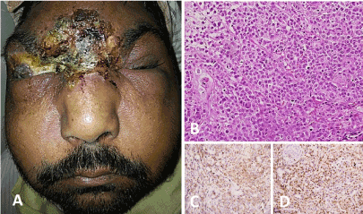 A 36-year-old man presented with crusted lesions on his forehead, dorsum of nose and right eye that had developed over a period of 2 months. He had occasional bloody and purulent discharge, without pain, and did not have constitutional or other systemic symptoms. Ocular examination revealed bilateral peri-orbital edema with erythema, conjunctival chemosis with right upper eyelid completely replaced by crusts, exposing the cornea (Figure 1A) resulting in absent vision on the right side. A clinical diagnosis of lethal midline granuloma was considered. Hematological investigations revealed leucocytosis with relative lymphocytosis and raised ESR. Urine microscopy (for casts or hematuria) and sputum analysis were normal. Biochemical tests for c-ANCA, p-ANCA and HIV were negative. Chest X-ray was normal. Computed tomography revealed soft tissue thickening and bony involvement with no lymphadenopathy or metastases. Multiple skin biopsies eventually confirmed NK/T cell lymphoma (Figures 1B-1D). The patient was admitted and SMILE regimen chemotherapy was started. However, the patient developed immunosuppression and meningitis with disease progression leading to death during hospital stay.