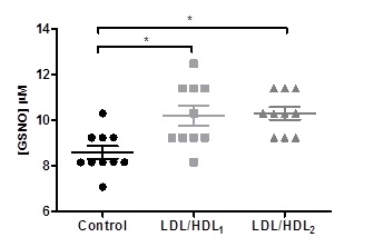 Statistically significant values of GSNO concentrations were obtained in the aliquots of blood samples treated with LDL/HDL1 (10.21 ± 1.393 µM) or LDL/HDL2 (10.31 ± 0.889 µM) when compared with the control aliquot 8.589 ± 0.9084 µM (Figure 1).