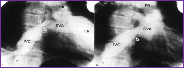 Figure 5. Selected cineangiographic frame from inferior vena cava (IVC) injection in right anterior oblique view demonstrating stenosis (arrows) of the IVC baffle (A - PRE) in a patient who had Mustard procedure several years previously. Following balloon angioplasty (B - POST), the narrowed segment improved (arrows). C, catheter; LV left ventricle; PA, pulmonary artery; SVA, systemic venous atrium. Reproduced from Rao PS, Wilson AD. (1992) Am Heart J 123: 244-248.