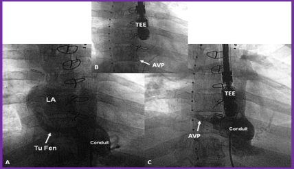 Figure 9. A. Selected cine frame from a Fontan conduit cineangiogram in antero-posterior view, demonstrating tubular fenestration (Tu Fen) with opacification of the left atrium (LA). B. The Tu Fen is closed with an Amplatzer Vascular Plug (AVP). C. A follow-up conduit cineangiogram after AVP implantation, showing complete occlusion of the Tu Fen. TEE, trans-esophageal probe. Reproduced from Rao PS. (2013) J Cardiovasc Dis Diagn 1: 104, 2013.