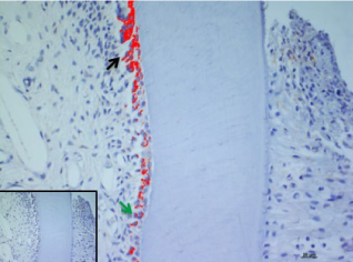 Figure 3. Osteoclastic cells (black arrows) immunoexpression of MacroH2A.1 on the PDL compression side (red color). Amplification: 40X; scale bar: 20μm. 113x85mm (300 x 300 DPI)