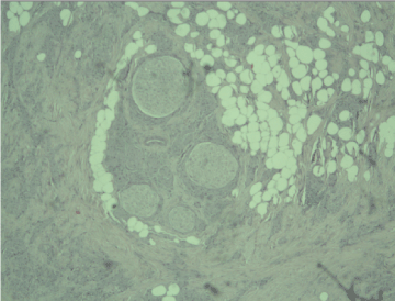 Figure 1. Peripheral nerves surrounded by nests of tumor cells, Н&E, x10