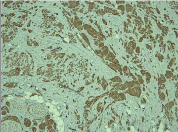 Mammary myofibroblastoma (MFB) is a rare benign mesenchymal tumor [1,2]. The name myofibroblastoma is used for the first time from Wargots, in 1987 [3]. Extramammary MFBs are reported in the literature and they are usually located in the inguinal area in elderly man [1]. These extramammary tumors are characterized by morphological and immunohistochemical features similar to the MFBs in the mammary gland. The tumor can occur in the skin of the breast, in soft tissues or in mammary lymph nodes [2,4,5]. The tumor is described in postmenopausal women and in older men. Children and young people are rarely affected. A thoughtful differential diagnosis is necessary to exclude different malignant mesenchymal tumors that resemble MFB morphologically.