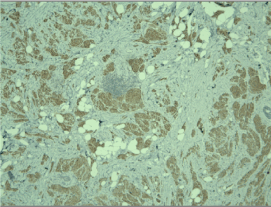 Figure 3. Positive cytoplasmic reaction for S-100 protein in tumor cells, x10