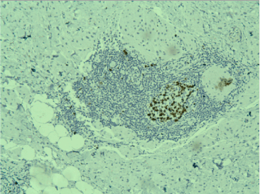 Figure 6. Positive nuclear reaction for Ki67 in a germinal center in a lymphoid follicle, low Ki67 in the tumor cells, x20