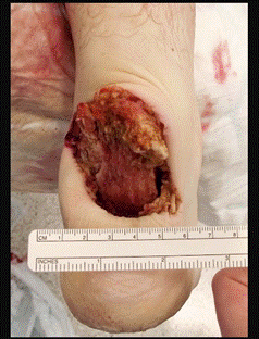 Figure 2. Intra-operative medical photograph of the right open calcaneal fracture. Photograph is taken after washout.