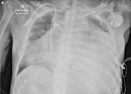 Figure 1A. Portable chest X-ray demonstrates nearly complete left hemithorax opacification with opacity extending into the right hemithorax. A haemodialysis line and dual-lead pacemaker are also present