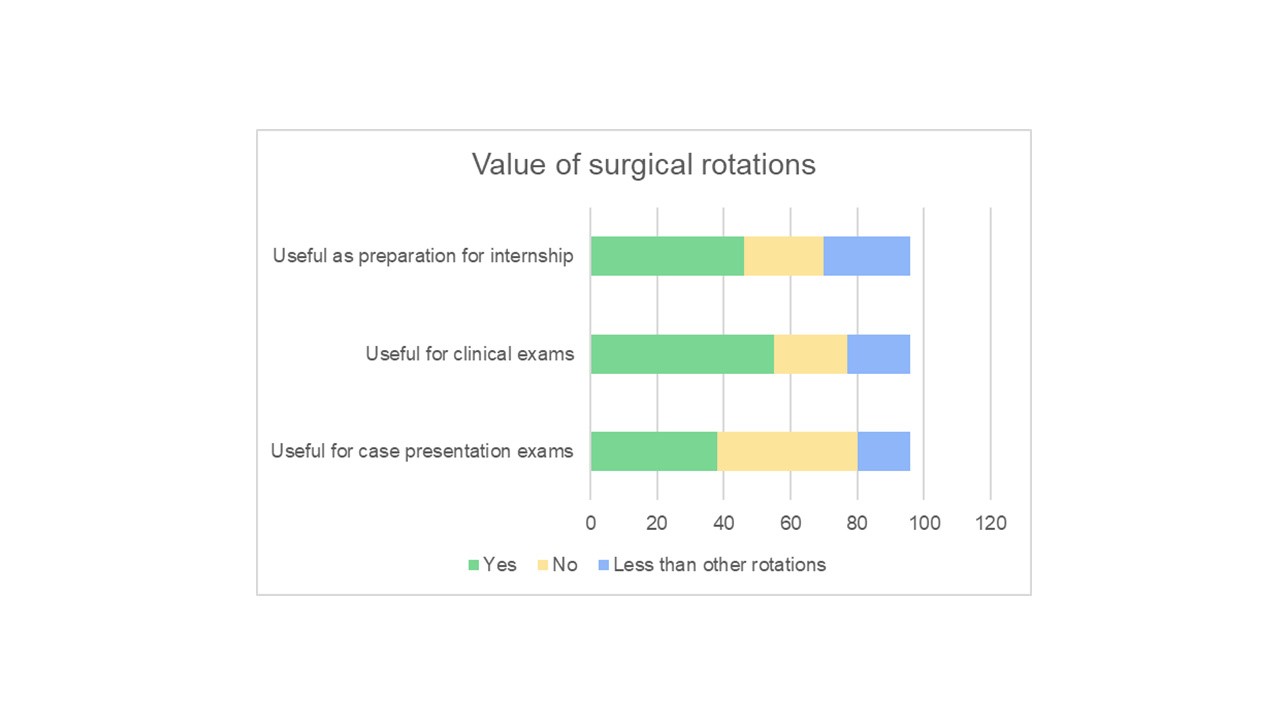 The survey was designed to assess surgical rotations in achieving academic, clinically relevant, and stimulating workplace experience. In addition, the survey gained responses on how rotation influenced career decisions.