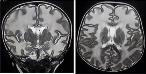 Figure 3. T2 weighted coronal and axial MR shows bilateral symmetrical white matter hyperintensity suggestive of dysmyelination