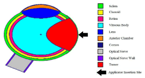 Figure 1. Eye analytical model (2 cm tumor), its structures and applicator site.Obtained with MCPlot tool [8].