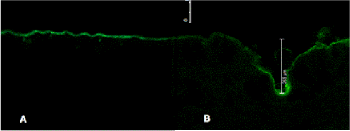 Both treated and untreated porcine skin membranes were stained with Alexa Fluor dye 488 and later sectioned using the Leica CM-1950 cyostat. Samples were then placed to rest on a clean microscope slide and observed under the CFM. Figure 2A shows an intact layer of skin in which the SC has not been disrupted, therefore showing no visualization of a microchannel. In contrary, Figure 2B shows a sample of pig ear skin which has been pretreated with a microneedle roller. The microchannel depth is 265 μm.