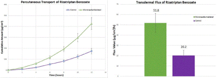 Migraine is a debilitating neurological disorder which is characterized by recurring pulsatile pain on one or both sides of the head. Triptans are used for the management of migraine. These therapeutic agents act by activating the serotonin 5-HTsignaling pathway. In this project, our aim was to develop transdermal drug delivery systems for two medications [frovatriptan succinate monohydrate and rizatriptan benzoate] commonly used for the management of migraine. The rationale is that transdermal drug delivery systems are capable in increasing the bioavailability of medications. In this project, we wanted to find out if microneedle rollers can significantly increase the percutaneous transport of frovatriptan succinate monohydrate and rizatriptan benzoate across pig ear skin in vitro. The flux value for microneedle-assisted drug permeation of frovatriptan across pig ear skin was 25.7 ± 2.5 µg/cm2/h in comparison to passive transdermal flux which was 13.46 ± 1.3 µg/cm2/h. The mean passive flux of rizatriptan was 20.2 ± 5.0 µg/cm2/h as compared to microneedle-mediated flux [51.8 ± 9.3 µg/cm2/h]. Student’s t-test determined that there was a statistically significant difference [p<0.05] between the flux values of microneedle-mediated transport of frovatriptan succinate monohydrate and rizatriptan benzoate across pig ear skin in comparison with passive diffusion.