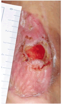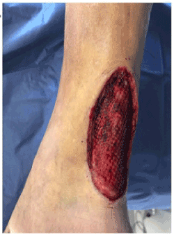 Figure 1. Therapy-resistant Achilles tendon ulcer in the center of a split skin graft after four weeks of CAP treatment three times a week for 90 seconds