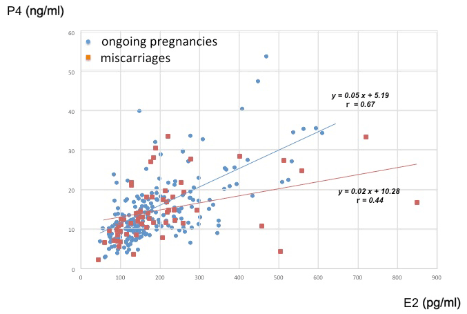 Figure 1. Scatter plot for E2 and P4 concentrations in letrozole-free cycles. Red squares indicate miscarriages (missing or undetectable heart beat at 12 weeks of gestation), and blue circles indicate ongoing pregnancies as a confirmed heart beat beyond 12 weeks of gestation.