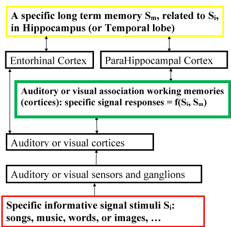 Figure 1. A simplified model of auditory or visual stimulation to retrieve or recall specific long term memories. S denotes a signal vector, subscript i and m respectively denote inputs and memories, arrow lines denote interactive circuits [26]