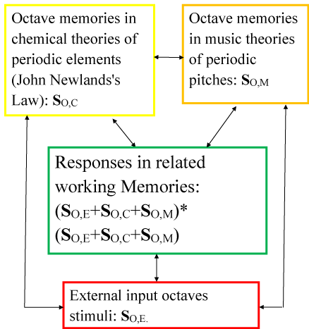 (Figure 2) demonstrates our simplified model of retrieving two correlated memories of a concept of octave in two different knowledge fields. The concept can be in chemical theories [29] periodic table of elements and/or in music theories: periodic pitches. Obviously, if there is not any octave memory (stored signal or information in the brain), there will be only the autocorrelation of external input signals, and the neurons will have no idea what an octave is, though they have the correspondent recalling ability; if there is only one octave memory and a correspondent retrieving ability, there will be a correlation between the input and stored signals as well as the autocorrelation of the input signals; if there are two octave memories and correspondent retrieving abilities, there will be correlations between the input and stored signals and between the stored signals as well as autocorrelation of the input signals. The correlation between the memories represents an association [18-20]. We think the association can produce creative thinking.