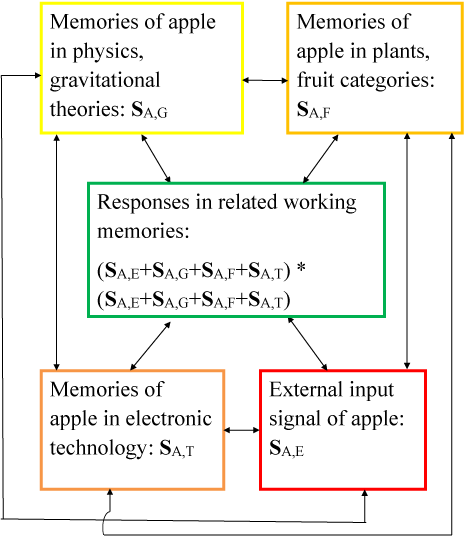 Figure 3. A simplified model of retrieving or recalling multiple correlated apple memories in different knowledge fields: signal stimuli and responses. Others are the same as that in Figure 1 or Figure 2