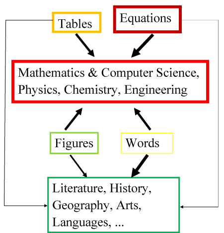 Figure 4 depicts our model of the brain (mental) activities of knowledge. Generally or usually, it is not very hard for mathematic, scientific or engineering people to learn liberal arts, oppositely, it is hard or very hard for liberal or artistic people to learn mathematics, sciences or engineering, because books (or knowledge) of mathematics and computer science, physics, chemistries, and engineering include words, figures and complicated tables and equations; books (or knowledge) of biology and medicine include words, figures and simple tables and equations; books (or knowledge) of literature and arts include words and figures only.