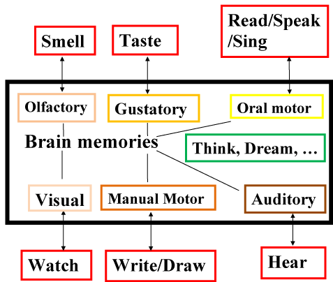 Figure 5. A simplified model to learn new concepts and to buildup correlated memories, e.g., apples, by smelling, tasting, reading/speaking/sing, watching, writing/drawing, and hearing. The linkages of brain neural networks are omitted