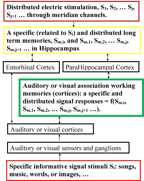 Figure 6 demonstrates a simplified model of specific auditory (music) or visual (images) signals plus distributed electric stimulation through meridian channels [21,22] to retrieve long term memories. The electric stimulation works like distributed mental excises to enhance distributed circuits or/and memories. However, the responses in the related working memories are distributed too. Therefore, our model in this figure gives an explain the clinical researches [14,15]: the distributed stimulation improves the patient’s recalling abilities, but may disturb normal people’s retrieving memories.