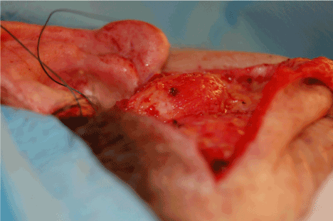 Figure 2. Completion of the closure of the postauricular extension of the incision which permits improved trimming and draping of the cervicofacial flap as well as in-setting .